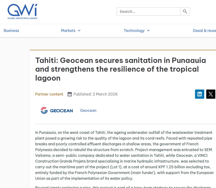 Global Water Intelligence : Tahiti: Geocean secures sanitation in Punaauia and strengthens the resilience of the tropical lagoon
